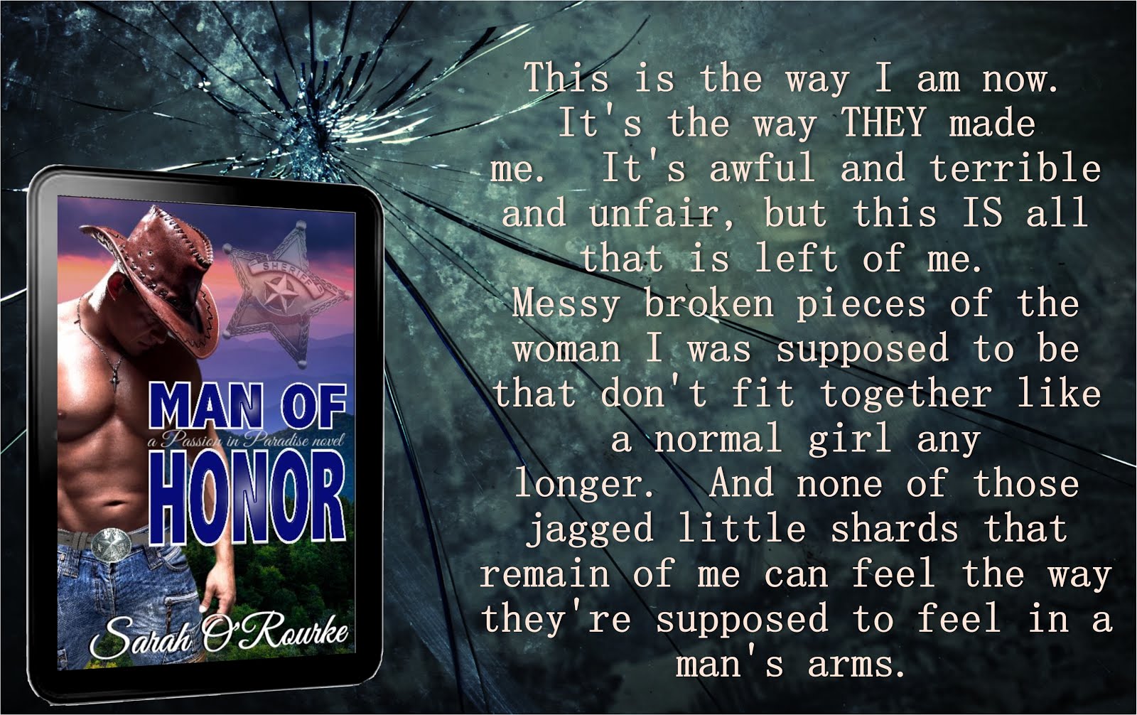 Honor McKinnon knows she is broken. Her body and soul had been shattered by a violent attack years ago, and no one…not her sisters or anyone else in the tiny town of Paradise, especially the Sheriff…can change that. Rather than dealing with her wounds, she chooses to protect herself from any further damage, even if that means that she avoids the one chance at love. But Zeke is determined to break down Honor’s walls…and to find the persons responsible for hurting her and make them suffer.
