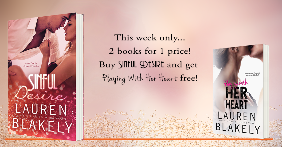This week ONLY when you buy SINFUL DESIRE (or if you preordered it!) you can get a FREE copy of Lauren’s USA Today Bestseller PLAYING WITH HER HEART. Every eBook of SINFUL DESIRE includes a link in the back of the book to redeem your free copy of PLAYING WITH HER HEART! All you have to do is simply click the link in the back of the book, follow the instructions, and you will be able to download a copy of PLAYING WITH HER HEART readable on any eReader. ONE-CLICK and get two books for one price! If you already read PLAYING WITH HER HEART, there is a paperback giveaway to enter.