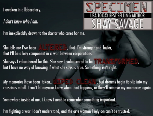 A soldier, a doctor, and a stark white laboratory full of lies. Specimen by Shay Savage is NOW LIVE! Amazon US: http://amzn.to/1SvKxVI Amazon UK: http://amzn.to/1SLBgHp Blurb I awaken in a laboratory. I don’t know who I am. I’m inexplicably drawn to the doctor who cares for me. She tells me I’ve been altered, that I’m …